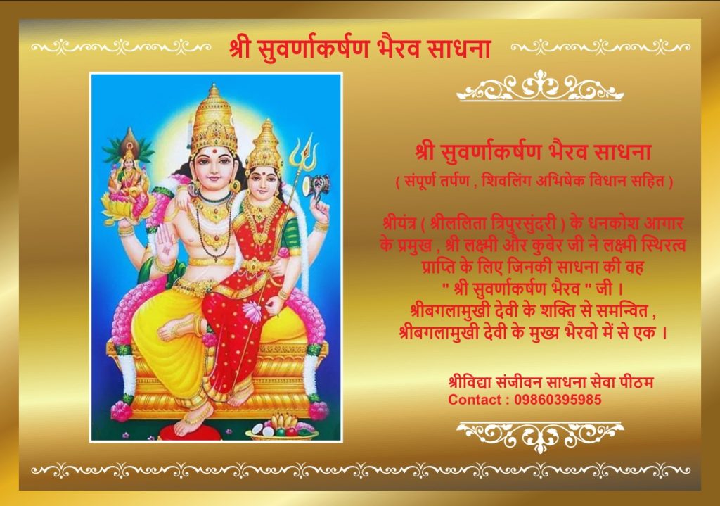 श्री स्वर्णाकर्षण भैरव देवता _ यह भगवान शिव अथवा महादेव के अवतार अथवा उनके भैरव नहीं हैं । यह भ्रामक कल्पना दूर कीजिए । देवी श्रीबगलामुखी का एक रूप ” श्री स्वर्णाकर्षिणी बगलामुखी “ हैं । क्योंकि _ उनके पास पीले तत्व की ऊर्जा आती हैं । सुवर्ण शक्ति का आधिपत्य उनके पास हैं । देवी बगलामुखी जी के पति श्री बगलेश्वर शिव हैं । इसलिए उनका एक रूप ” श्री स्वर्णाकर्षण भैरव “ हैं । ” श्री स्वर्णाकर्षण भैरव और उनकी पत्नी श्री स्वर्णाकर्षिणी देवी “ इस तरह से _ इसलिए इनकी साधना एक महाविद्या स्तर की हैं ।